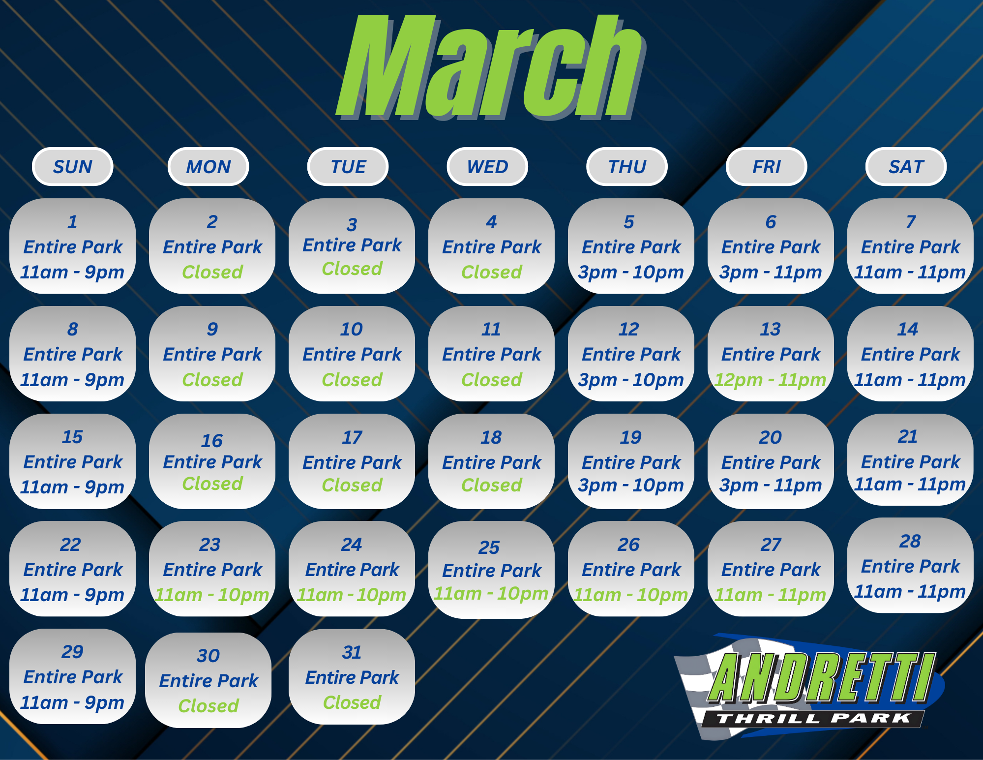 Mon-Wed: CLOSED, Thu: 3pm - 10pm, Fri: 3pm - 11pm, Sat: 11am - 11pm, Sun: 11am - 9pm